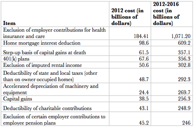 The following table contains the top ten items, which constitute more than half of all tax expenditures: