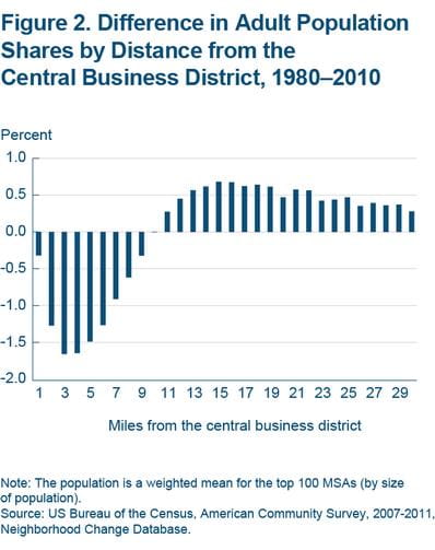 One can see the shift of population away from the core more clearly by looking at population shares. Figure 2 shows changes in population shares by distance from the city center for these 100 metro areas. Neighborhoods within 10 miles of the urban core have seen their population shares decline, while neighborhoods 10 to 30 miles from the core have seen their population shares rise. This outward shift of population shares is widespread across the 100 metro areas, with 96 percent of them seeing a decline in the share of the population within 5 miles of the urban core between 1980 and 2010.