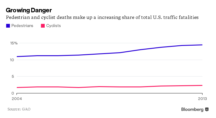 From BloombergBusiness, "More American Pedestrians and Cyclists Are Getting Killed on the Roads: What's really happening is that overall traffic deaths have fallen sharply, while pedestrian and cyclist deaths have remained flat." by Patrick Clark: